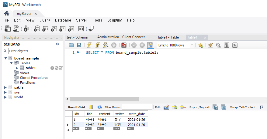 이제 MySQL Workbench 에서 아래와 같이 db설정, 테이블 추가를 해주면 된다.