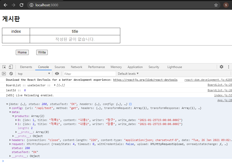 그리고 서버 실행, npm 실행 해보면 아래와 같이 브라우저에 콘솔로 결과를 확인할 수 있다.