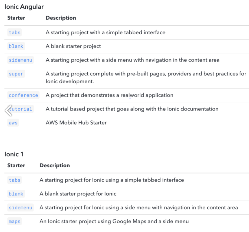 위의 표를 보지 않아도 ionic start-list 를 사용하면 리스트와 설명을 볼 수 있다.