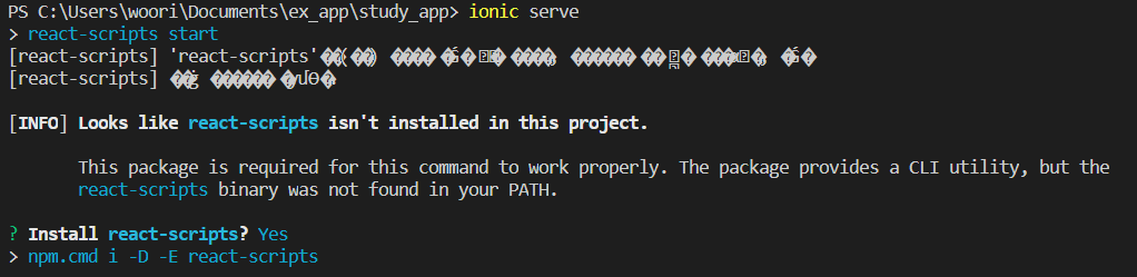 그랬더니 react-script 를 설치할거냐 물어보길래 일단 yes....