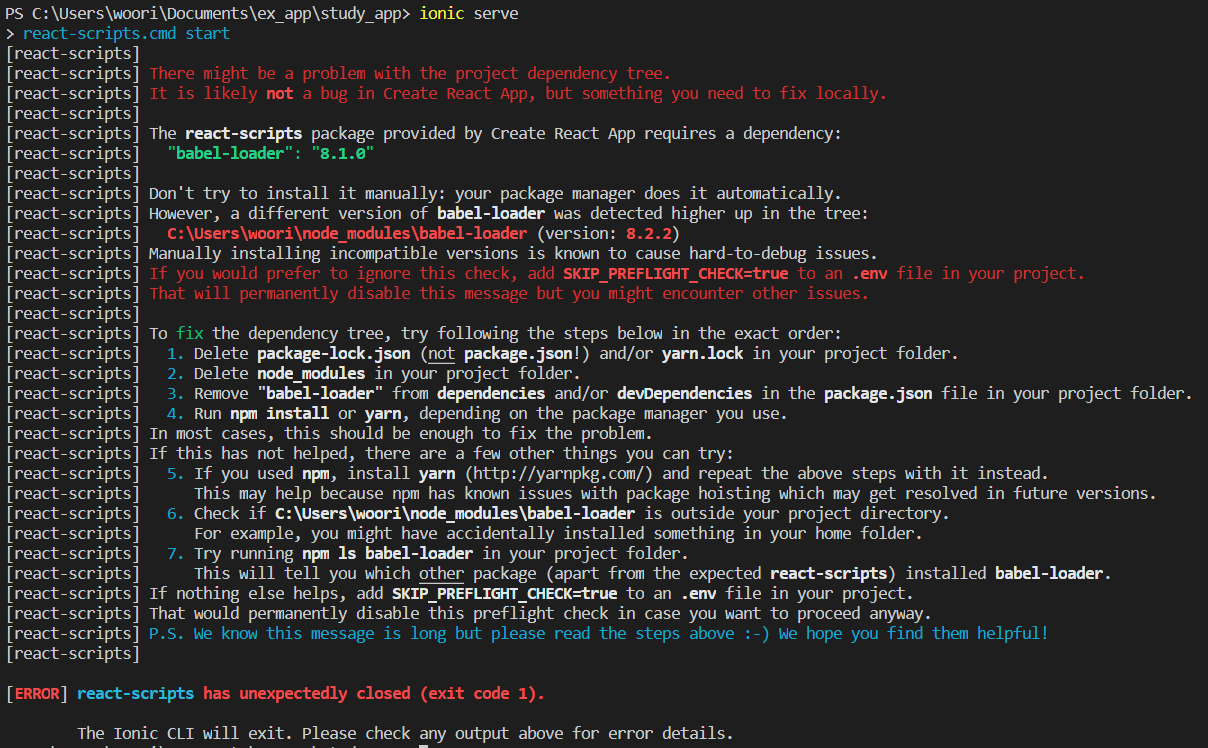 babel-loader 버전 문젠가.. 그런데 수동으로 설치하지 말라니 일단 package-lock.json 삭제, node_modules 폴더 삭제하고 package.json 에서 dependencies 에 있는 babel-loader 버전을 바꿔 주었다.