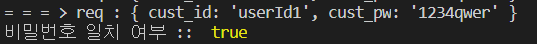 클라이언트로부터 전달받은 pw 는 'qwer1234' 이지만 password :: 쪽을 보면 암호화 되어 알수없는 문자로 변환 되었다.