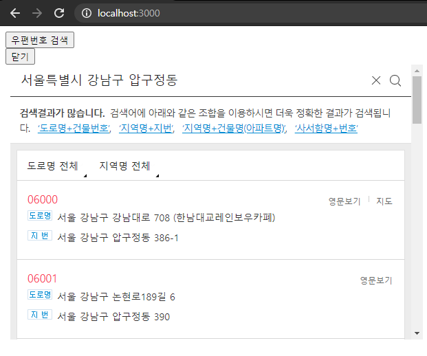 오늘은 react 에서 오픈 api 를 사용하여 우편번호 찾기 기능을 구현 해볼 것이다.
